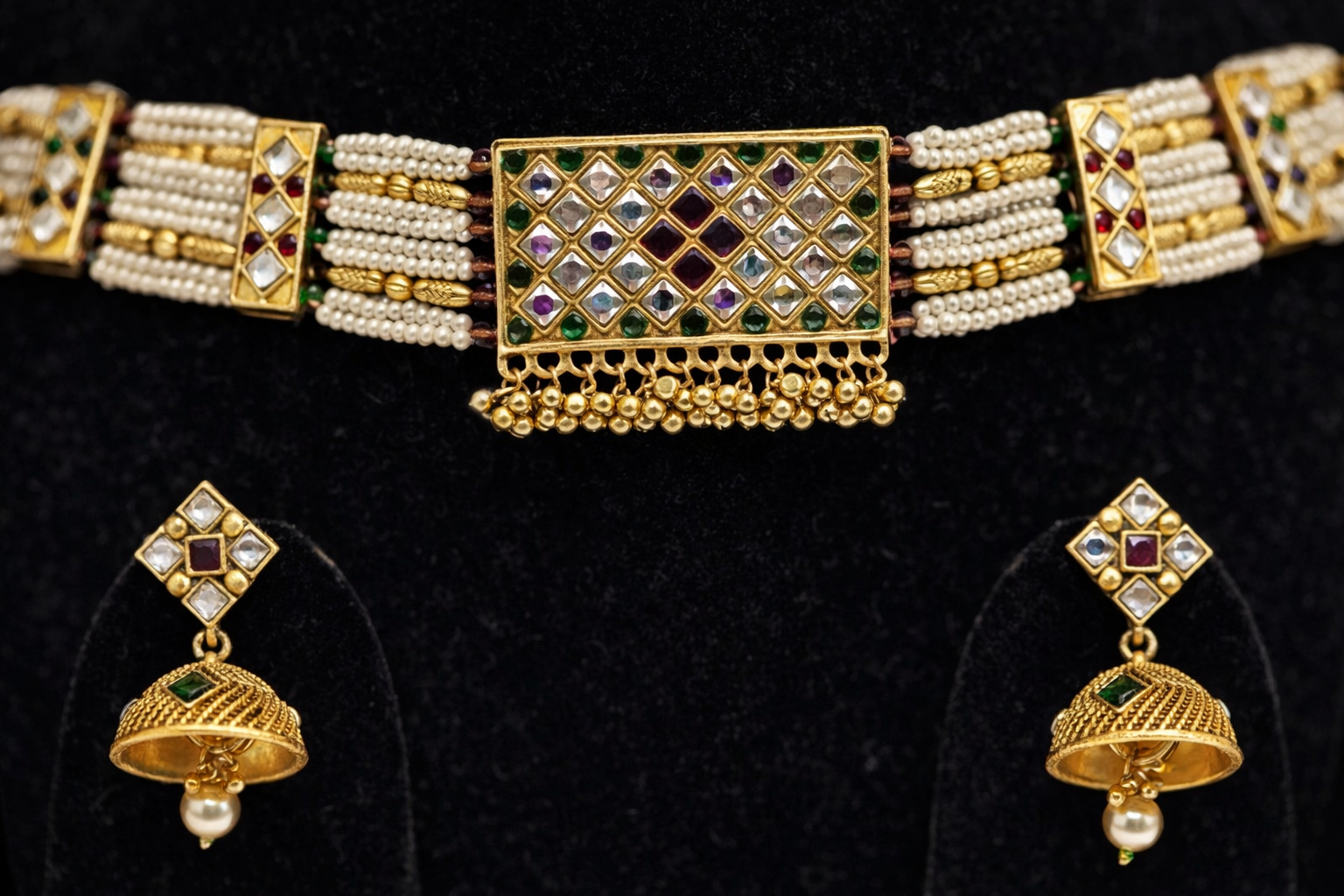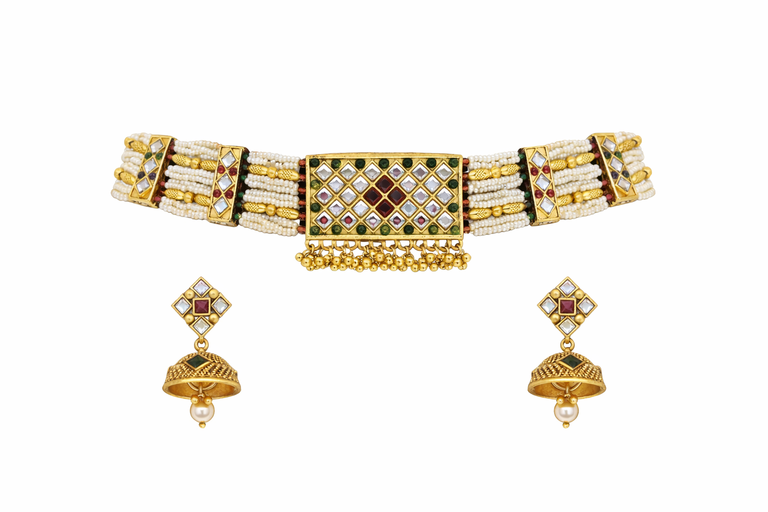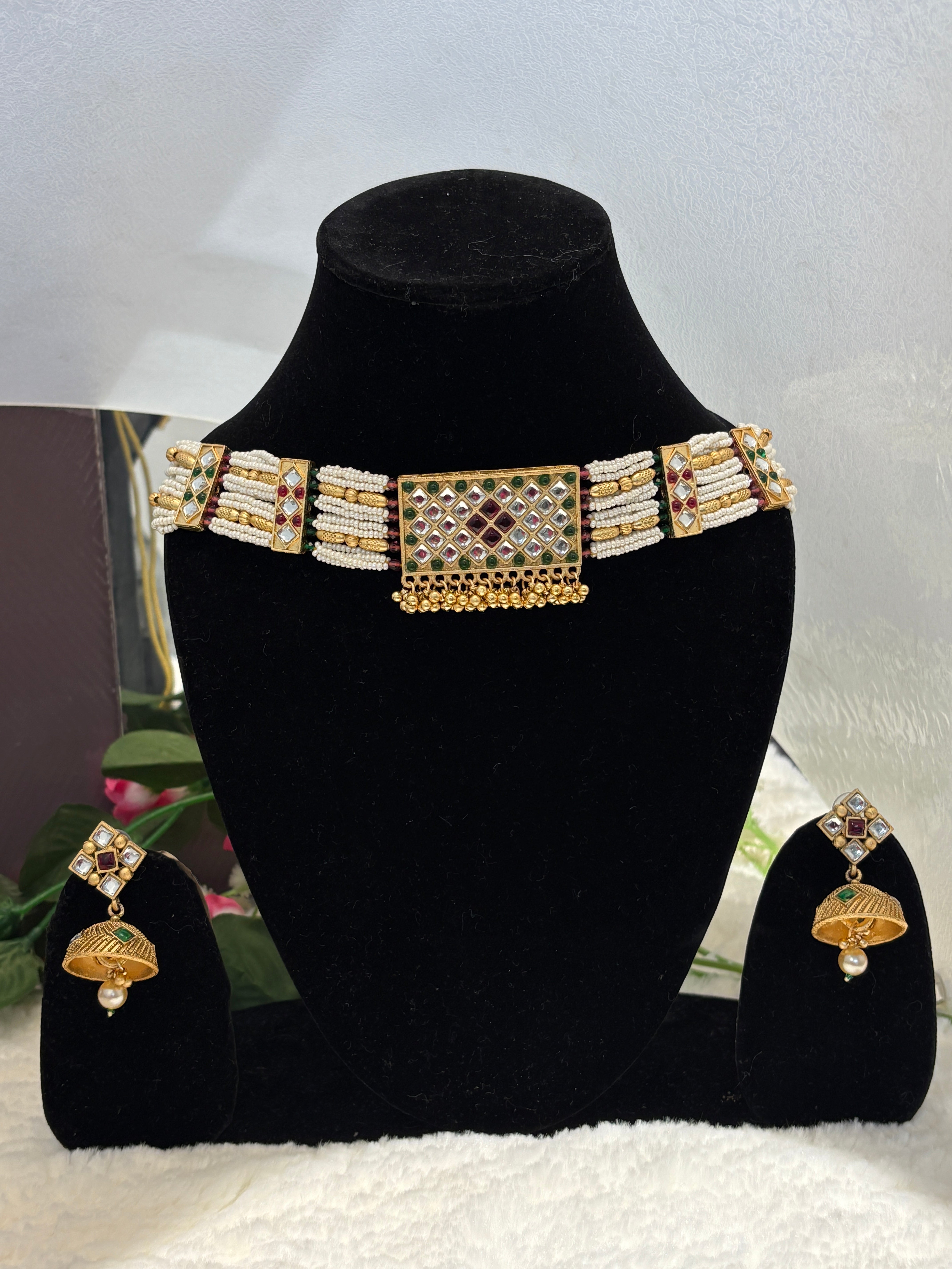 Elevate your ethnic look with this exquisite traditional choker necklace set, crafted in classic Kundan style. The choker features a richly detailed rectangular centerpiece adorned with multicolored Kundan stones set in a gold-tone framework, complemented by rows of delicate pearls for a regal finish. Elegant gold bead danglers add graceful movement and charm.